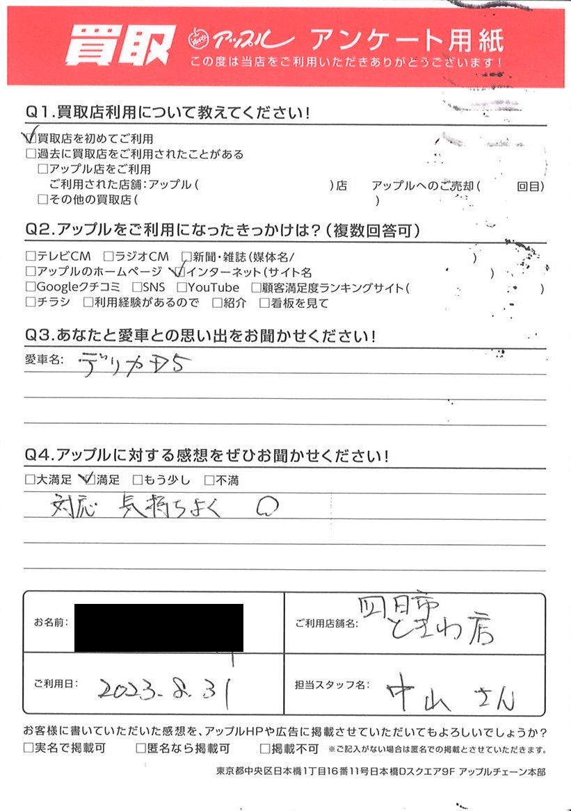 お車のご相談・ 査定だけでもOK! カンタン 入力 30秒 アップルがブランド買取始めました! お電話でも受付中! 受付時間10:00 ~ 18:30 0120-174-177 お車のご相談・ 査定だけでもOK! カンタン 入力 30秒 アップルがブランド買取始めました! お電話でも受付中! 受付時間10:00 ~ 18:30 0120-174-177 アップルがブランド買取始めました! お電話でも受付中! 受付時間10:00 ~ 18:30 0120-174-177 店舗情報 在庫車 スタッフ紹介 ブログ お客様の声 キャンペーン お得 無料査定 click お客様の声 ご記入日: 2023/08/31 H様 車名:三菱 デリカD:5 対応気持ちよく〇 前へ 次へ お客様の声一覧を見る