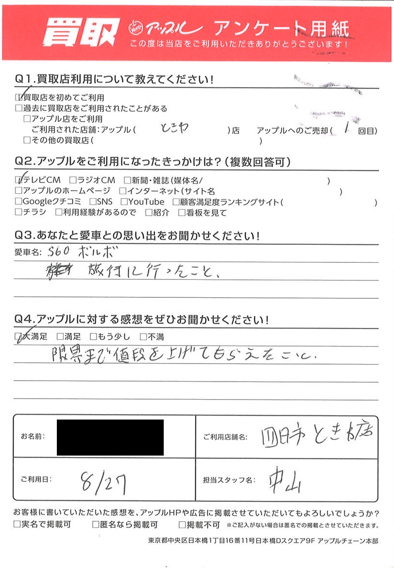 お車のご相談・ 査定だけでもOK! カンタン 入力 30秒 アップルがブランド買取始めました! お電話でも受付中! 受付時間10:00 ~ 18:30 0120-174-177 お車のご相談・ 査定だけでもOK! カンタン 入力 30秒 アップルがブランド買取始めました! お電話でも受付中! 受付時間10:00 ~ 18:30 0120-174-177 アップルがブランド買取始めました! お電話でも受付中! 受付時間10:00 ~ 18:30 0120-174-177 店舗情報 在庫車 スタッフ紹介 ブログ お客様の声 キャンペーン お得 無料査定 click お客様の声 ご記入日: 2023/08/27 H様 車名:ボルボ S60 限界まで値段を上げてもらえたこと 前へ 次へ お客様の声一覧を見る