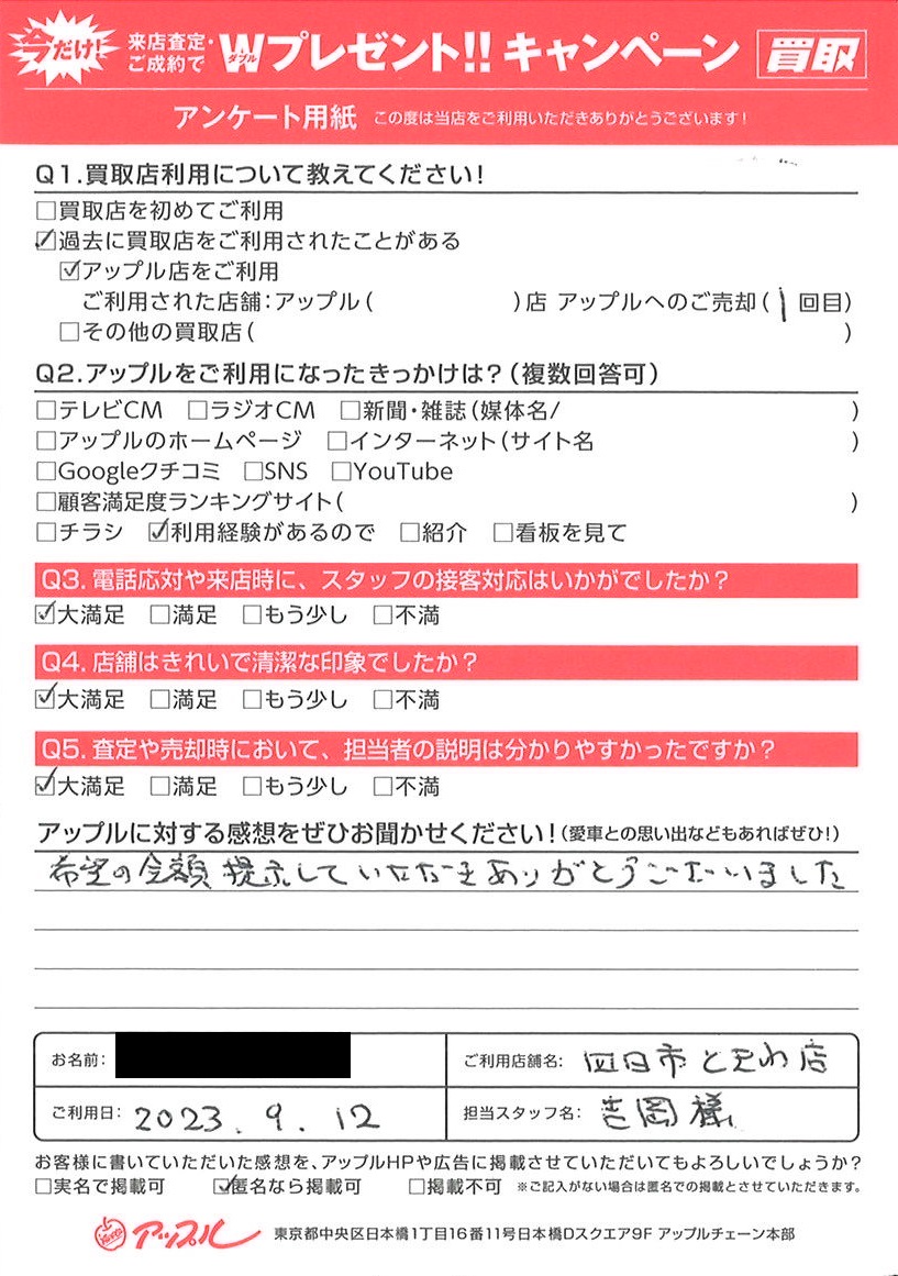 お車のご相談・ 査定だけでもOK! カンタン 入力 30秒 アップルがブランド買取始めました! お電話でも受付中! 受付時間10:00 ~ 18:30 0120-174-177 お車のご相談・ 査定だけでもOK! カンタン 入力 30秒 アップルがブランド買取始めました! お電話でも受付中! 受付時間10:00 ~ 18:30 0120-174-177 アップルがブランド買取始めました! お電話でも受付中! 受付時間10:00 ~ 18:30 0120-174-177 店舗情報 在庫車 スタッフ紹介 ブログ お客様の声 キャンペーン お得 無料査定 click お客様の声 ご記入日: 2023/09/12 Y様 車名:トヨタ プリウス(2023年3月~のPHVを含む) 希望の金額提示していただきありがとうございました。 前へ 次へ お客様の声一覧を見る