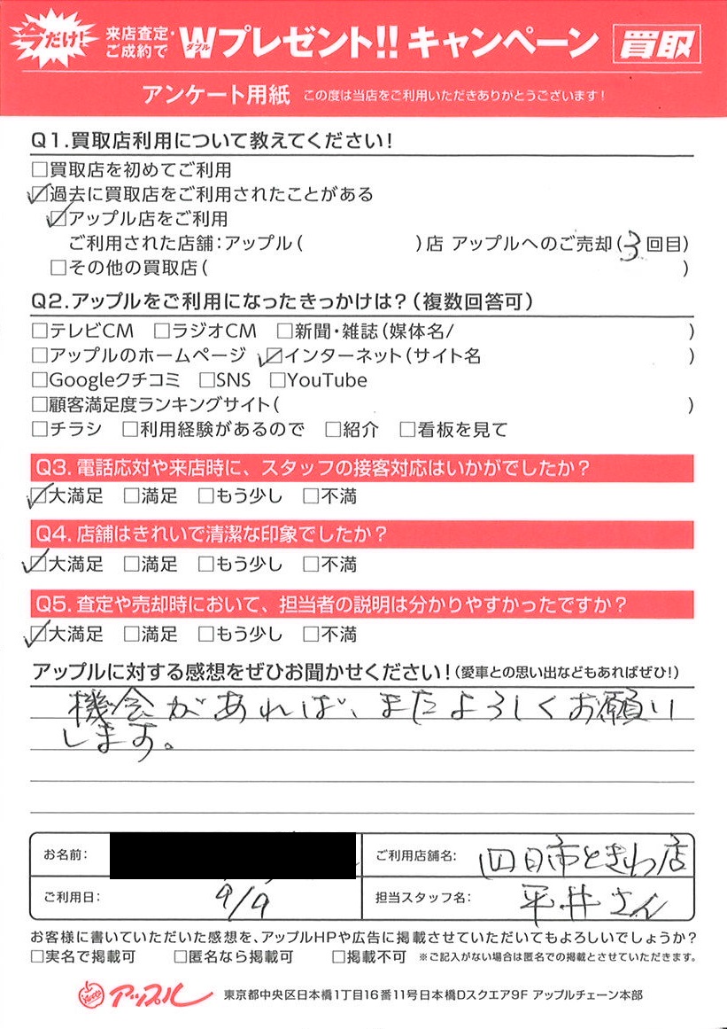 お車のご相談・ 査定だけでもOK! カンタン 入力 30秒 アップルがブランド買取始めました! お電話でも受付中! 受付時間10:00 ~ 18:30 0120-174-177 お車のご相談・ 査定だけでもOK! カンタン 入力 30秒 アップルがブランド買取始めました! お電話でも受付中! 受付時間10:00 ~ 18:30 0120-174-177 アップルがブランド買取始めました! お電話でも受付中! 受付時間10:00 ~ 18:30 0120-174-177 店舗情報 在庫車 スタッフ紹介 ブログ お客様の声 キャンペーン お得 無料査定 click お客様の声 ご記入日: 2023/09/09 U様 車名:三菱 アイ・ミーブ 機会があれば、またよろしくお願いします。 前へ 次へ お客様の声一覧を見る