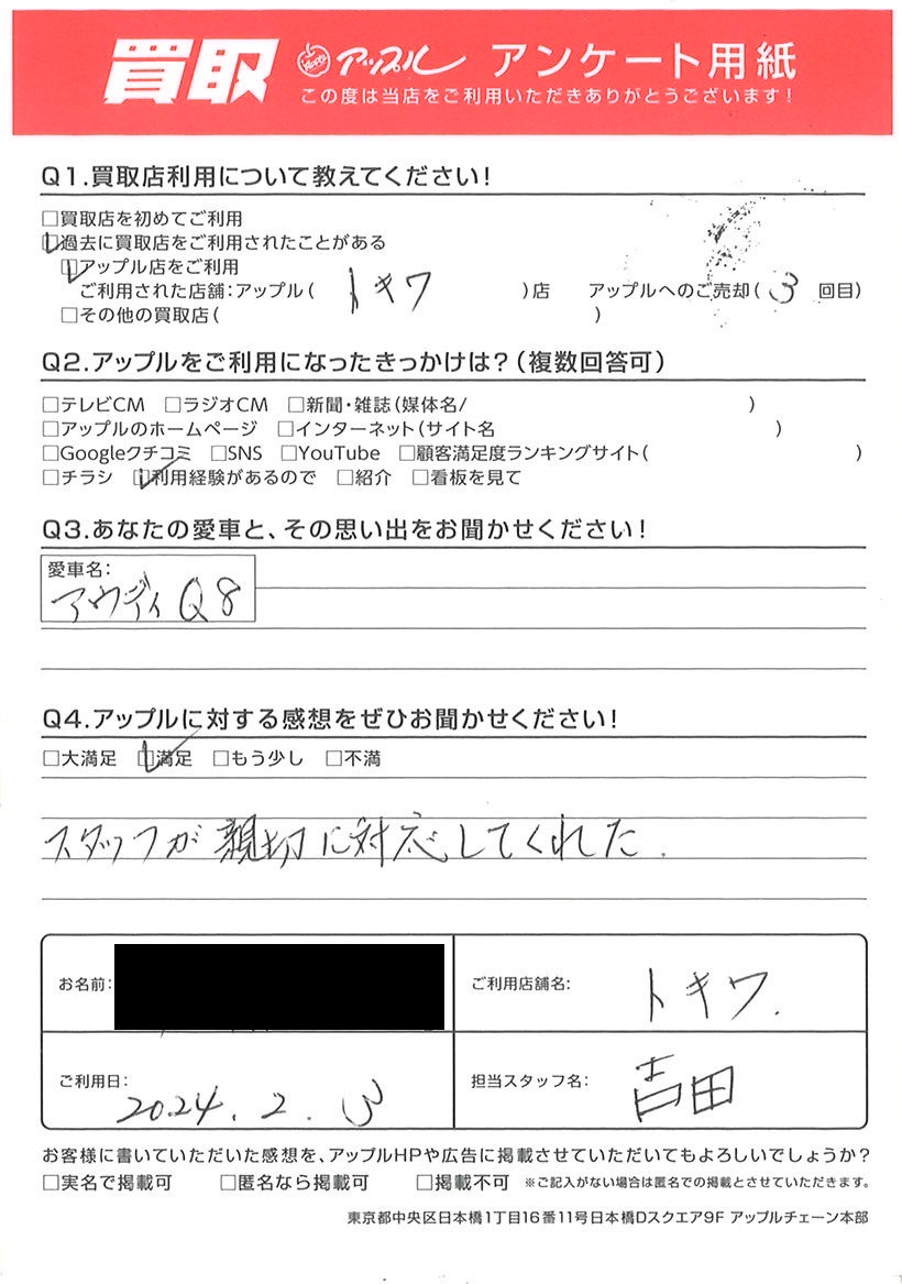 お車のご相談・ 査定だけでもOK! カンタン 入力 30秒 アップルがブランド買取始めました! お電話でも受付中! 受付時間10:00 ~ 18:30 0120-174-177 お車のご相談・ 査定だけでもOK! カンタン 入力 30秒 アップルがブランド買取始めました! お電話でも受付中! 受付時間10:00 ~ 18:30 0120-174-177 アップルがブランド買取始めました! お電話でも受付中! 受付時間10:00 ~ 18:30 0120-174-177 店舗情報 在庫車 スタッフ紹介 ブログ お客様の声 キャンペーン お得 無料査定 click お客様の声 ご記入日: 2024/02/03 I様 車名:アウディ Q8 スタッフが親切に対応してくれた 前へ 次へ お客様の声一覧を見る