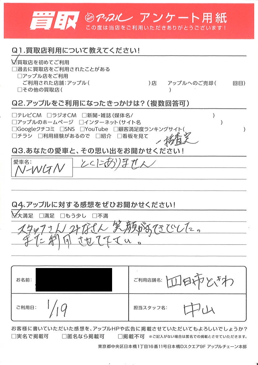お車のご相談・ 査定だけでもOK! カンタン 入力 30秒 アップルがブランド買取始めました! お電話でも受付中! 受付時間10:00 ~ 18:30 0120-174-177 お車のご相談・ 査定だけでもOK! カンタン 入力 30秒 アップルがブランド買取始めました! お電話でも受付中! 受付時間10:00 ~ 18:30 0120-174-177 アップルがブランド買取始めました! お電話でも受付中! 受付時間10:00 ~ 18:30 0120-174-177 店舗情報 在庫車 スタッフ紹介 ブログ お客様の声 キャンペーン お得 無料査定 click お客様の声 ご記入日: 2024/01/19 M様 車名:ホンダ N-WGN スタッフさんみなさん笑顔がすてきでした。また利用させて下さい。 前へ 次へ お客様の声一覧を見る