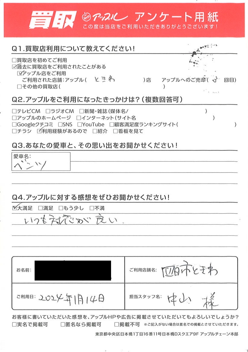 お車のご相談・ 査定だけでもOK! カンタン 入力 30秒 アップルがブランド買取始めました! お電話でも受付中! 受付時間10:00 ~ 18:30 0120-174-177 お車のご相談・ 査定だけでもOK! カンタン 入力 30秒 アップルがブランド買取始めました! お電話でも受付中! 受付時間10:00 ~ 18:30 0120-174-177 アップルがブランド買取始めました! お電話でも受付中! 受付時間10:00 ~ 18:30 0120-174-177 店舗情報 在庫車 スタッフ紹介 ブログ お客様の声 キャンペーン お得 無料査定 click お客様の声 ご記入日: 2024/01/14 Y様 車名:メルセデス・ベンツ Aクラス いつも対応が良い 前へ 次へ お客様の声一覧を見る