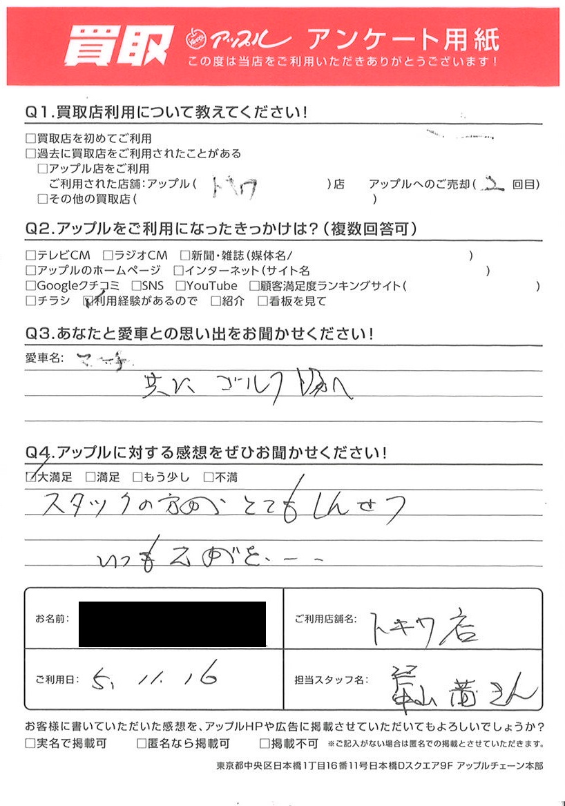 お車のご相談・ 査定だけでもOK! カンタン 入力 30秒 アップルがブランド買取始めました! お電話でも受付中! 受付時間10:00 ~ 18:30 0120-174-177 お車のご相談・ 査定だけでもOK! カンタン 入力 30秒 アップルがブランド買取始めました! お電話でも受付中! 受付時間10:00 ~ 18:30 0120-174-177 アップルがブランド買取始めました! お電話でも受付中! 受付時間10:00 ~ 18:30 0120-174-177 店舗情報 在庫車 スタッフ紹介 ブログ お客様の声 キャンペーン お得 無料査定 click お客様の声 ご記入日: 2023/11/16 S様 車名:日産 マーチ スタッフの方が、とてもしんせついつもえがを・・・ 前へ 次へ お客様の声一覧を見る