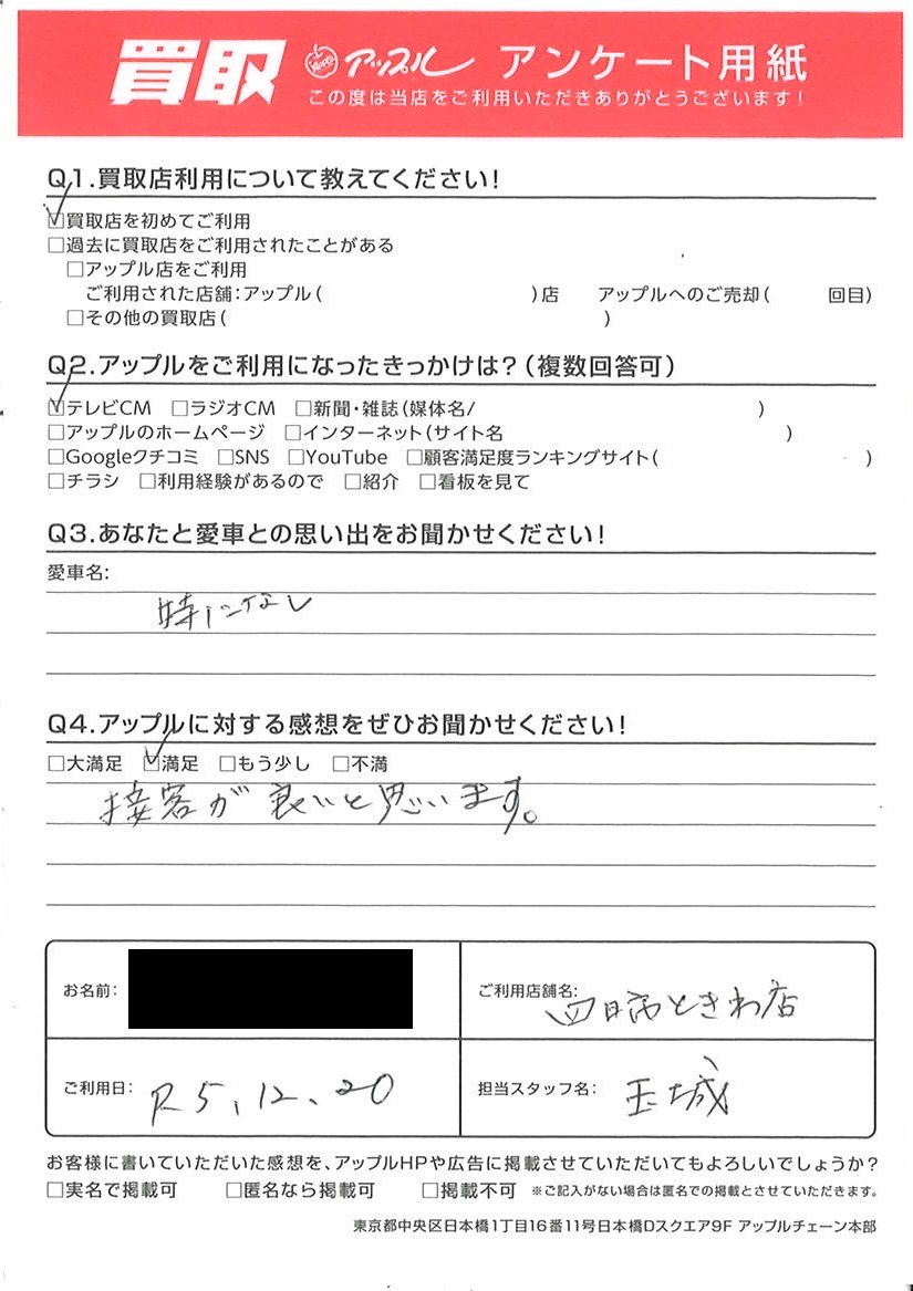 お車のご相談・ 査定だけでもOK! カンタン 入力 30秒 アップルがブランド買取始めました! お電話でも受付中! 受付時間10:00 ~ 18:30 0120-174-177 お車のご相談・ 査定だけでもOK! カンタン 入力 30秒 アップルがブランド買取始めました! お電話でも受付中! 受付時間10:00 ~ 18:30 0120-174-177 アップルがブランド買取始めました! お電話でも受付中! 受付時間10:00 ~ 18:30 0120-174-177 店舗情報 在庫車 スタッフ紹介 ブログ お客様の声 キャンペーン お得 無料査定 click お客様の声 ご記入日: 2023/12/20 S様 車名:マツダ フレアワゴン 接客が良いと思います。 前へ 次へ お客様の声一覧を見る