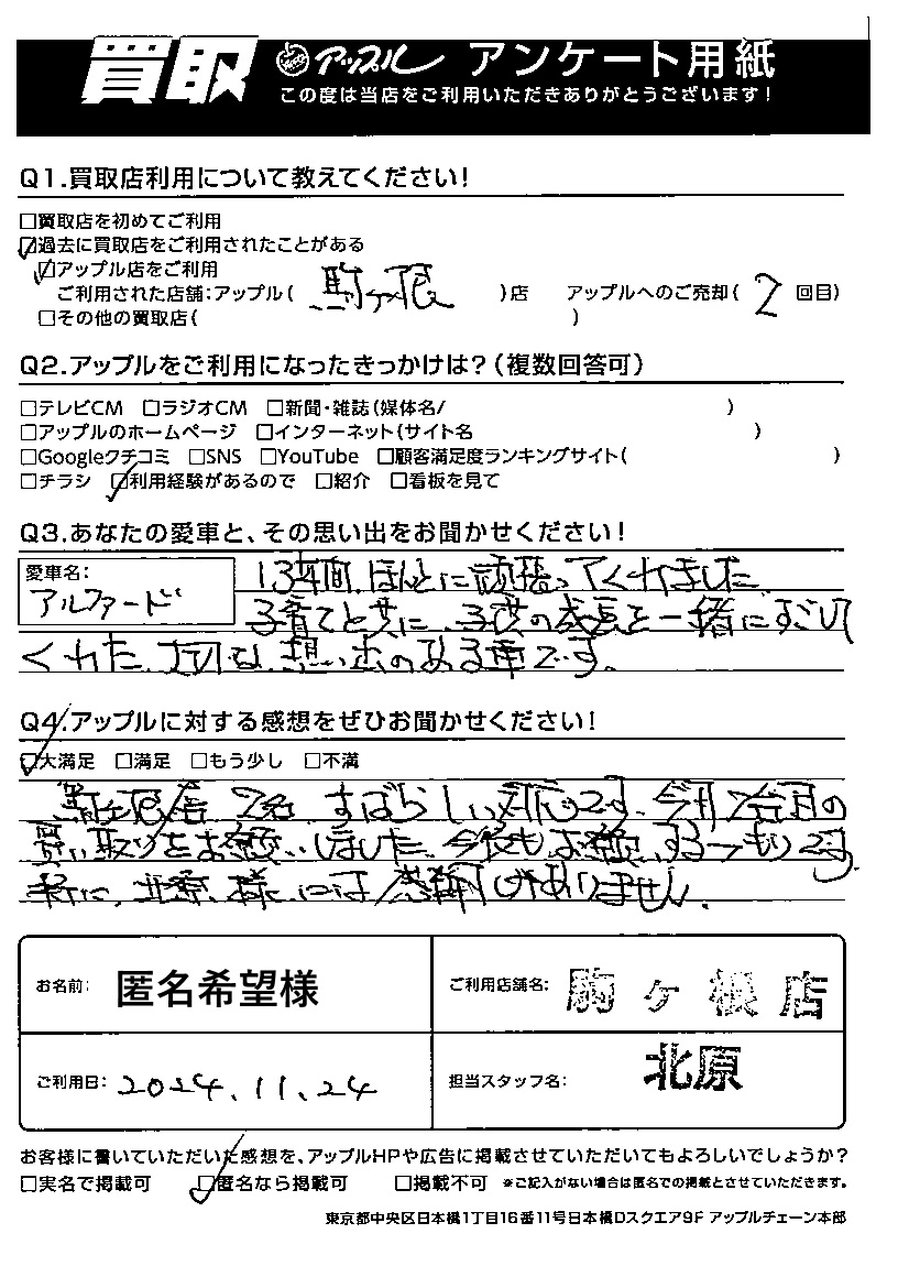 匿名希望様 車名:トヨタ アルファード(H27年1月~のHYBRID含む)