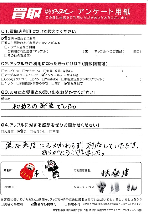 お車のご相談・ 査定だけでもOK! カンタン 入力 30秒 アップルがブランド買取始めました! お電話でも受付中! 受付時間10:00 ~ 19:00 0120-43-2228 お車のご相談・ 査定だけでもOK! カンタン 入力 30秒 アップルがブランド買取始めました! お電話でも受付中! 受付時間10:00 ~ 19:00 0120-43-2228 アップルがブランド買取始めました! お電話でも受付中! 受付時間10:00 ~ 19:00 0120-43-2228 店舗情報 在庫車 スタッフ紹介 ブログ お客様の声 キャンペーン 無料査定 click お客様の声 ご記入日: 2022/11/01 R.M様 車名:ダイハツ タント (愛車との思い出)初めての新車でした。(アップルに対するご感想)急な来店にもかかわらず、対応していただき、ありがとうございました。 前へ 次へ お客様の声一覧を見る