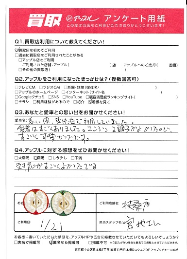 お車のご相談・ 査定だけでもOK! カンタン 入力 30秒 アップルがブランド買取始めました! お電話でも受付中! 受付時間10:00 ~ 19:00 0120-43-2228 お車のご相談・ 査定だけでもOK! カンタン 入力 30秒 アップルがブランド買取始めました! お電話でも受付中! 受付時間10:00 ~ 19:00 0120-43-2228 アップルがブランド買取始めました! お電話でも受付中! 受付時間10:00 ~ 19:00 0120-43-2228 店舗情報 在庫車 スタッフ紹介 ブログ お客様の声 キャンペーン 無料査定 click お客様の声 ご記入日: 2023/01/21 S.K様 車名:スズキ エブリイ (愛車との思い出)長い間、車中泊で利用していました。愛着はすごくありました。エンジンは調子がよかったので、すごく可愛かったです。(アップルに対するご感想)対応がすごくよかったです。 前へ 次へ お客様の声一覧を見る