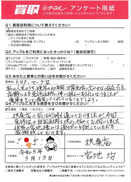 扶桑店の前は何時も通っておりましたが、今回免許証の自主返納を決め、初めてお伺いしました。担当の宮地様には適切に対処していただき感謝致しております。