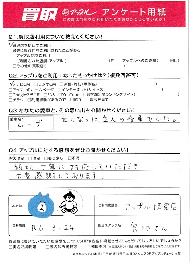 お車のご相談・ 査定だけでもOK! カンタン 入力 30秒 アップルがブランド買取始めました! お電話でも受付中! 受付時間10:00 ~ 19:00 0120-43-2228 お車のご相談・ 査定だけでもOK! カンタン 入力 30秒 アップルがブランド買取始めました! お電話でも受付中! 受付時間10:00 ~ 19:00 0120-43-2228 アップルがブランド買取始めました! お電話でも受付中! 受付時間10:00 ~ 19:00 0120-43-2228 店舗情報 在庫車 スタッフ紹介 ブログ お客様の声 キャンペーン 無料査定 click お客様の声 ご記入日: 2024/03/24 A.M様 車名:ダイハツ ムーヴ (愛車との思い出)亡くなった主人の愛車でした。(アップルに対するご感想)親切、丁寧に対応していただき大変感謝しております。 前へ 次へ お客様の声一覧を見る