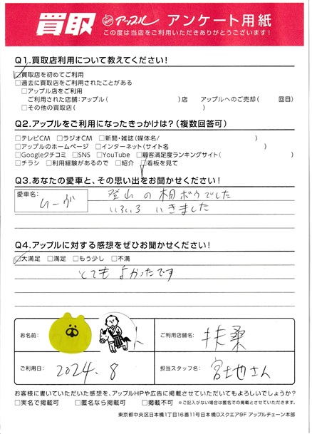 お車のご相談・ 査定だけでもOK! カンタン 入力 30秒 アップルがブランド買取始めました! お電話でも受付中! 受付時間10:00 ~ 19:00 0120-43-2228 お車のご相談・ 査定だけでもOK! カンタン 入力 30秒 アップルがブランド買取始めました! お電話でも受付中! 受付時間10:00 ~ 19:00 0120-43-2228 アップルがブランド買取始めました! お電話でも受付中! 受付時間10:00 ~ 19:00 0120-43-2228 店舗情報 在庫車 スタッフ紹介 ブログ お客様の声 キャンペーン 無料査定 click お客様の声 ご記入日: 2024/08/15 M.K様 車名:ダイハツ ムーヴ (愛車との思い出)ムーヴ・登山の相棒でした。いろいろいきました。(アップルに対するご感想)とてもよかったです。 前へ 次へ お客様の声一覧を見る