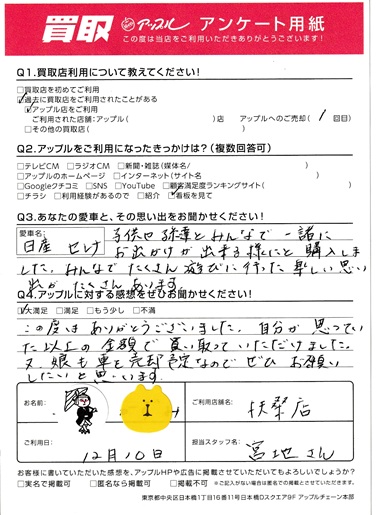 この度はありがとうございました。自分が思っていた以上の金額で買い取っていただけました。又、娘も車を売却予定なのでぜひお願いしたいと思います。