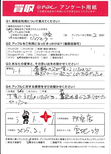 お車のご相談・ 査定だけでもOK! カンタン 入力 30秒 アップルがブランド買取始めました! お電話でも受付中! 受付時間10:00 ~ 19:00 0120-43-2228 お車のご相談・ 査定だけでもOK! カンタン 入力 30秒 アップルがブランド買取始めました! お電話でも受付中! 受付時間10:00 ~ 19:00 0120-43-2228 アップルがブランド買取始めました! お電話でも受付中! 受付時間10:00 ~ 19:00 0120-43-2228 店舗情報 在庫車 スタッフ紹介 ブログ お客様の声 キャンペーン 無料査定 click お客様の声 ご記入日: 2025/02/01 T.S様 車名:日産 ノート (愛車との思い出)高齢の父が乗っていたので事故が心配でしかたなかった。(アップルに対するご感想)丁寧に対応いただき、査定も早くてありがたかった。 前へ 次へ お客様の声一覧を見る
