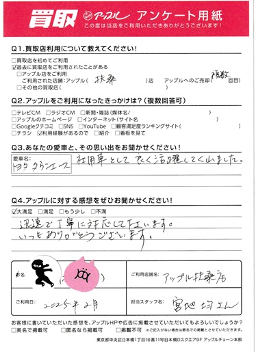 お車のご相談・ 査定だけでもOK! カンタン 入力 30秒 アップルがブランド買取始めました! お電話でも受付中! 受付時間10:00 ~ 19:00 0120-43-2228 お車のご相談・ 査定だけでもOK! カンタン 入力 30秒 アップルがブランド買取始めました! お電話でも受付中! 受付時間10:00 ~ 19:00 0120-43-2228 アップルがブランド買取始めました! お電話でも受付中! 受付時間10:00 ~ 19:00 0120-43-2228 店舗情報 在庫車 スタッフ紹介 ブログ お客様の声 キャンペーン 無料査定 click お客様の声 ご記入日: 2025/02/25 S様 車名:トヨタ タウンエースバン (愛車との思い出)タウンエース、社用車として良く活躍してくれました。(アップルに対するご感想)迅速で丁寧に対応してくださいます。いつもありがとうございます。 前へ 次へ お客様の声一覧を見る