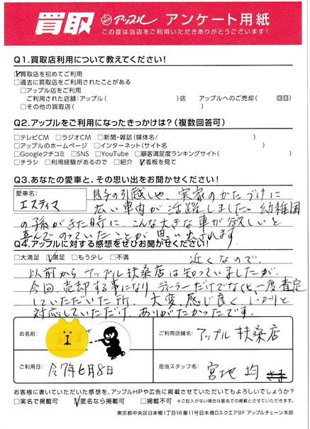近くなので以前からアップル扶桑店は知っていましたが今回売却する事になりディーラーだけでなく一度査定していただいた所、大変感じ良くしっかりと対応していただけ、ありがたかったです。