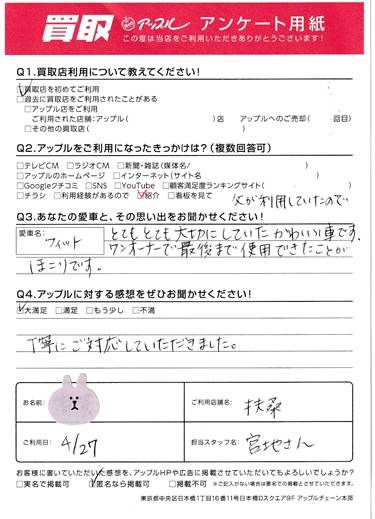 フィット、とてもとても大切にしていた かわいい車です。ワンオーナーで最後まで使用できたことがほこりです。