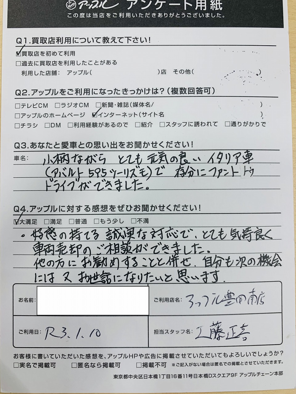 お車のご相談・ 査定だけでもOK! カンタン 入力 30秒 アップルがブランド買取始めました! お電話でも受付中! 受付時間09:30 ~ 18:00 0565-53-8800 お車のご相談・ 査定だけでもOK! カンタン 入力 30秒 アップルがブランド買取始めました! お電話でも受付中! 受付時間09:30 ~ 18:00 0565-53-8800 アップルがブランド買取始めました! お電話でも受付中! 受付時間09:30 ~ 18:00 0565-53-8800 店舗情報 在庫車 スタッフ紹介 ブログ お客様の声 キャンペーン お得 無料査定 click お客様の声 ご記入日: 2021/01/10 匿名様 車名:アバルト 595 小柄ながらとても元気の良いイタリア車(アバルト595ツーリズモ)で存分にファントトゥドライブができました。 前へ 次へ お客様の声一覧を見る