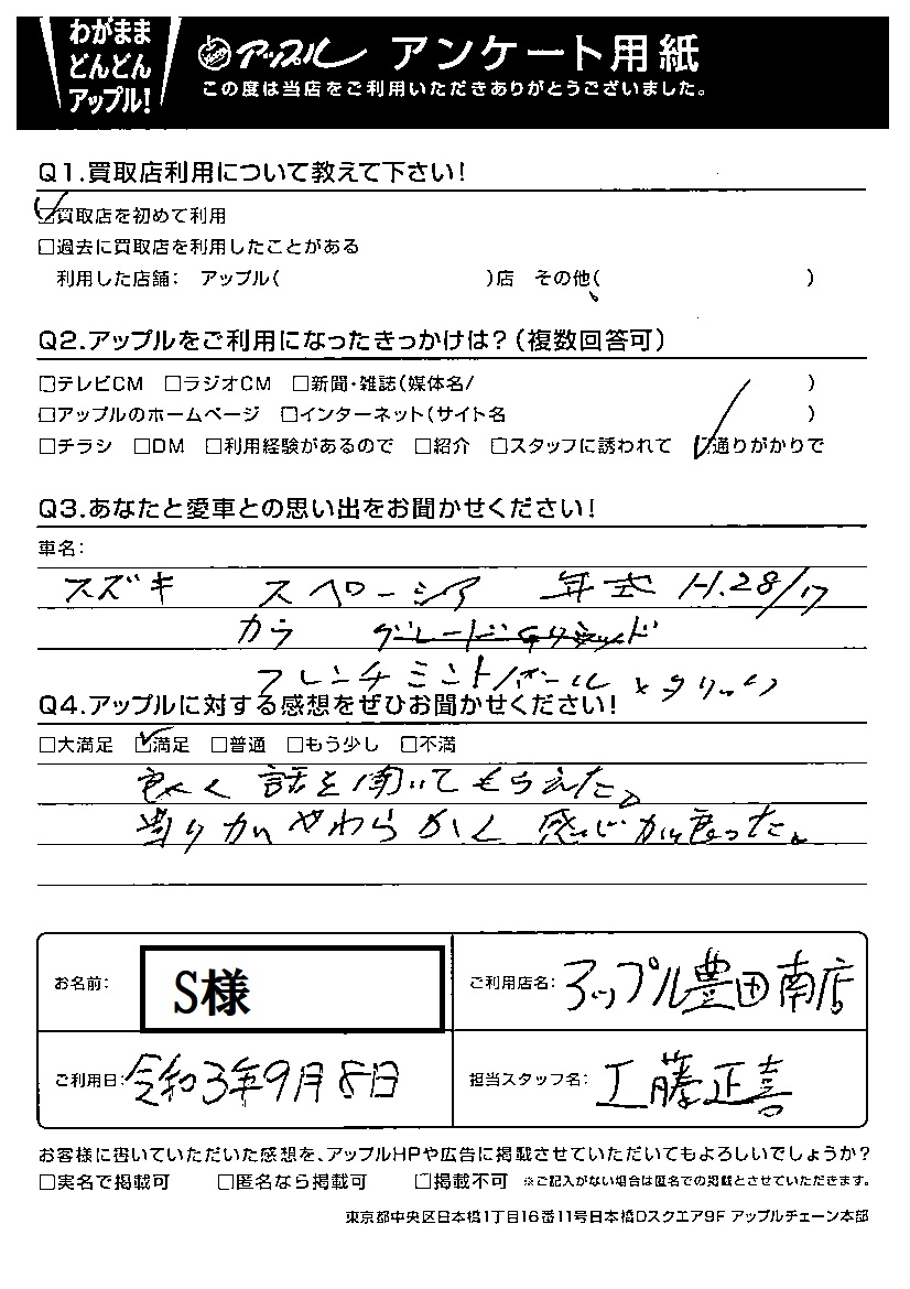 お車のご相談・ 査定だけでもOK! カンタン 入力 30秒 アップルがブランド買取始めました! お電話でも受付中! 受付時間09:30 ~ 18:00 0565-53-8800 お車のご相談・ 査定だけでもOK! カンタン 入力 30秒 アップルがブランド買取始めました! お電話でも受付中! 受付時間09:30 ~ 18:00 0565-53-8800 アップルがブランド買取始めました! お電話でも受付中! 受付時間09:30 ~ 18:00 0565-53-8800 店舗情報 在庫車 スタッフ紹介 ブログ お客様の声 キャンペーン お得 無料査定 click お客様の声 ご記入日: 2021/09/08 匿名様 車名:スズキ スペーシア 良く話を聞いてもらえた。当たりがやわらかく感じが良かった。 前へ 次へ お客様の声一覧を見る