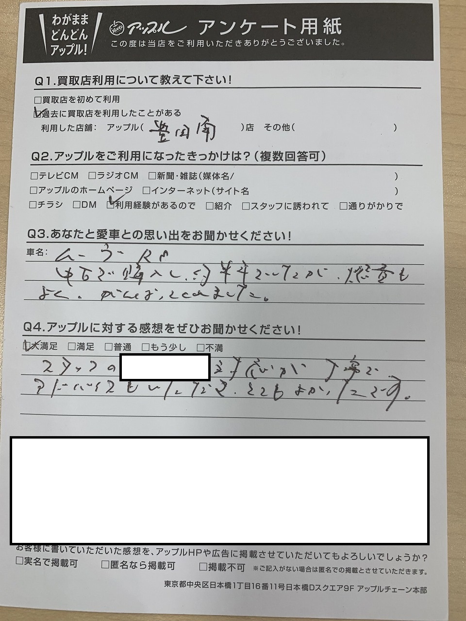 お車のご相談・ 査定だけでもOK! カンタン 入力 30秒 アップルがブランド買取始めました! お電話でも受付中! 受付時間09:30 ~ 18:00 0565-53-8800 お車のご相談・ 査定だけでもOK! カンタン 入力 30秒 アップルがブランド買取始めました! お電話でも受付中! 受付時間09:30 ~ 18:00 0565-53-8800 アップルがブランド買取始めました! お電話でも受付中! 受付時間09:30 ~ 18:00 0565-53-8800 店舗情報 在庫車 スタッフ紹介 ブログ お客様の声 キャンペーン お得 無料査定 click お客様の声 ご記入日: 2021/09/11 愛知県豊田市 M様 車名:ダイハツ ムーヴ スタッフの対応が丁寧でアドバイスも頂きとても良かったです。 前へ 次へ お客様の声一覧を見る