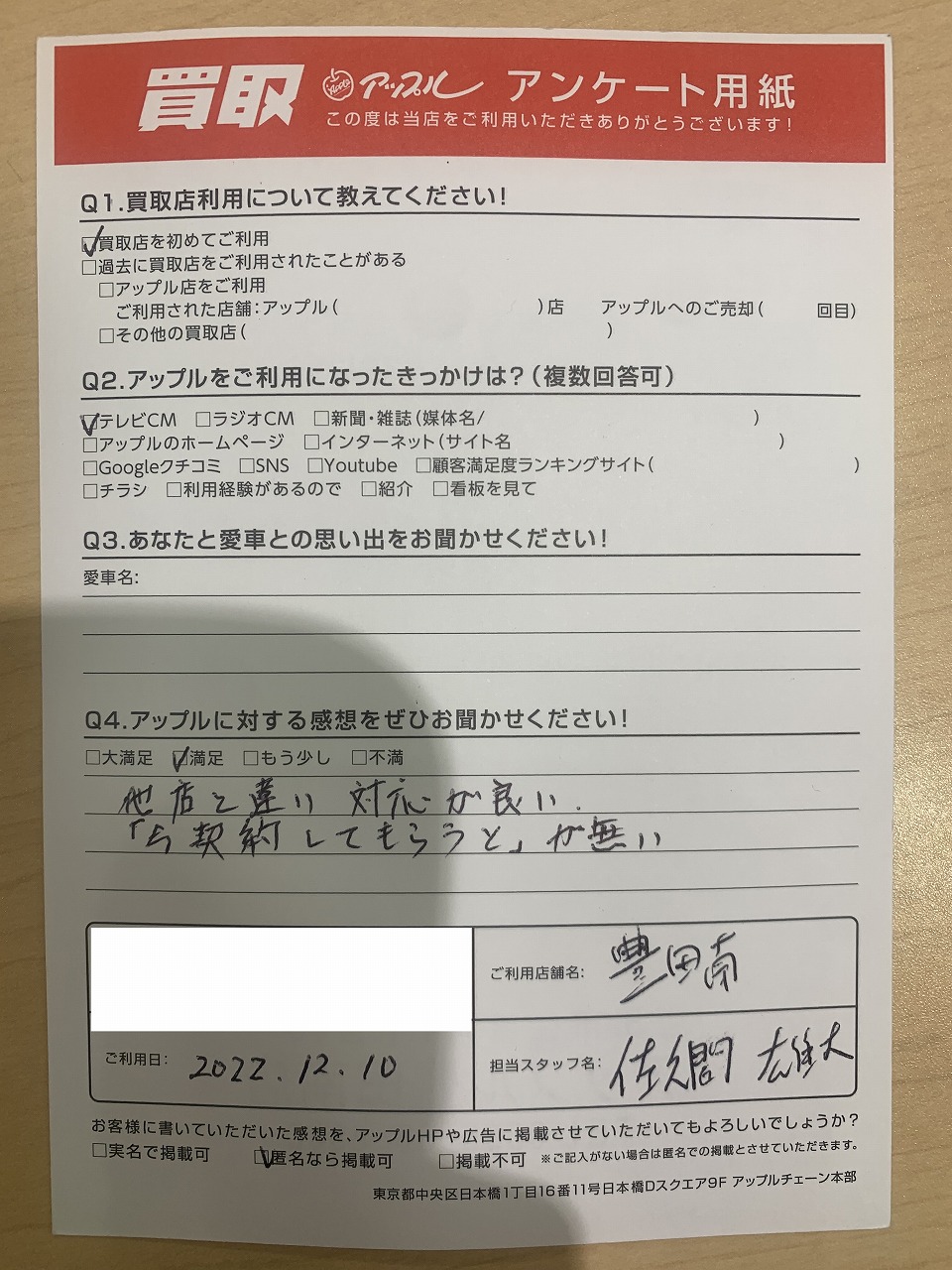 お車のご相談・ 査定だけでもOK! カンタン 入力 30秒 アップルがブランド買取始めました! お電話でも受付中! 受付時間09:30 ~ 18:00 0565-53-8800 お車のご相談・ 査定だけでもOK! カンタン 入力 30秒 アップルがブランド買取始めました! お電話でも受付中! 受付時間09:30 ~ 18:00 0565-53-8800 アップルがブランド買取始めました! お電話でも受付中! 受付時間09:30 ~ 18:00 0565-53-8800 店舗情報 在庫車 スタッフ紹介 ブログ お客様の声 キャンペーン お得 無料査定 click お客様の声 ご記入日: 2022/12/10 豊田市 匿名様 車名:トヨタ カローラスポーツ 他店と違い対応が良い「今契約してもらうと」が無い 前へ 次へ お客様の声一覧を見る