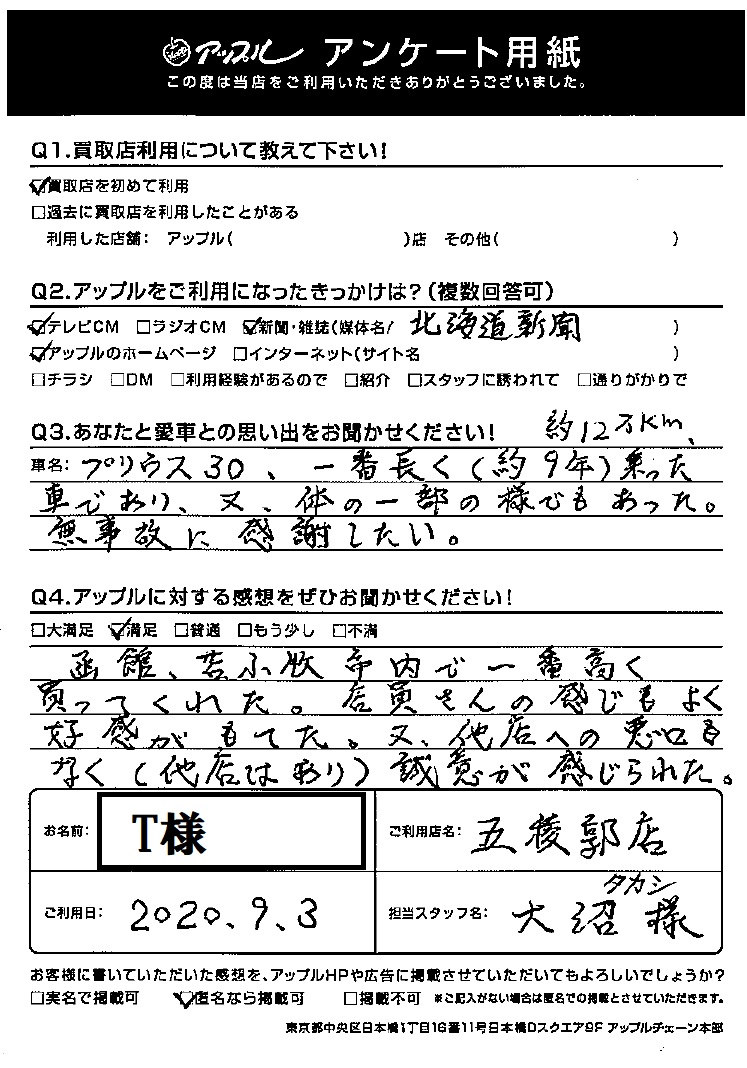 函館、苫小牧市内で一番高く買ってくれた。店員さんの感じもよく好感がもてた。又、他店への悪口もなく(他店はあり)、誠意が感じられた。