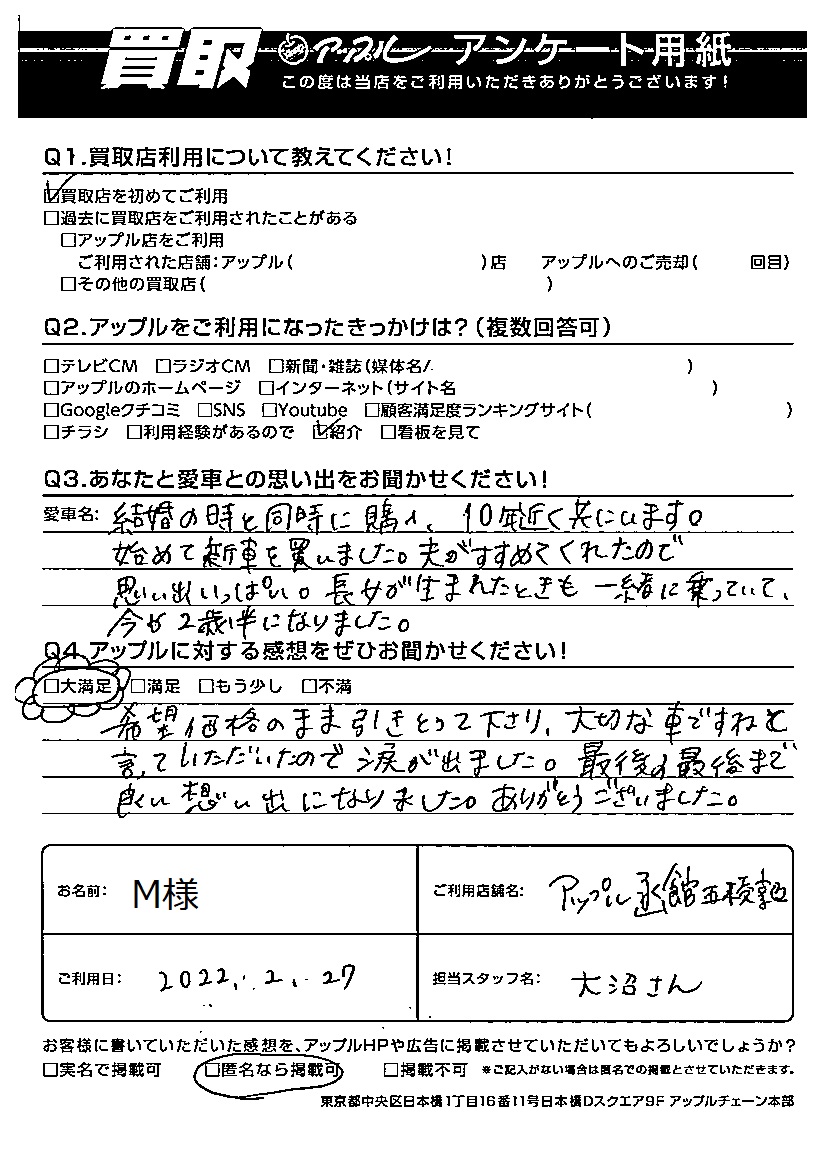希望価格のまま引きとって下さり、大切な車ですねと言っていただいたので涙が出ました。