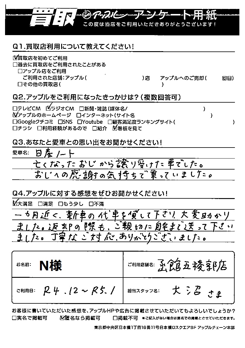 一ヵ月近く新車の代車を貸して下さり、大変助かりました。返却の際も、ご親切に自宅まで送って下さいました。丁寧なご対応、ありがとうございました。