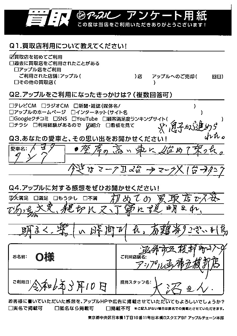 O様 車名:トヨタ タンク