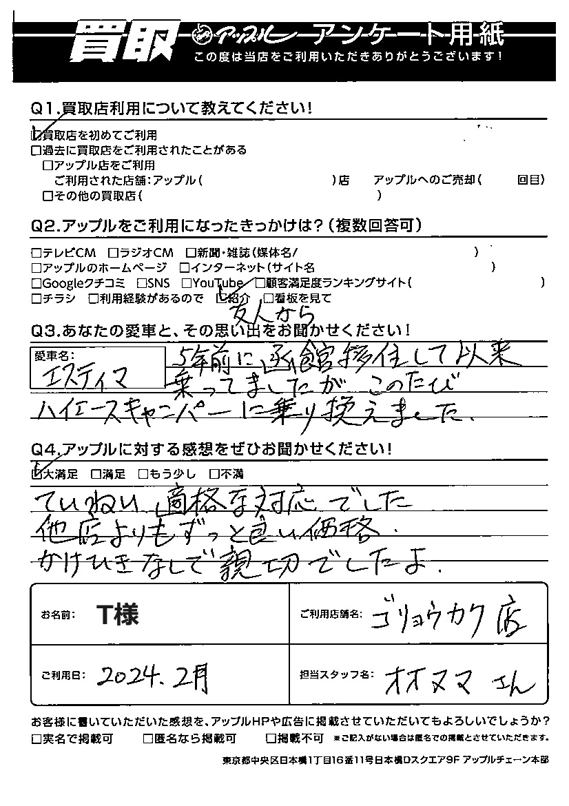 ていねい、適正な対応でした。他店よりもずっと良い価格、かけひきなしで親切でしたよ。
