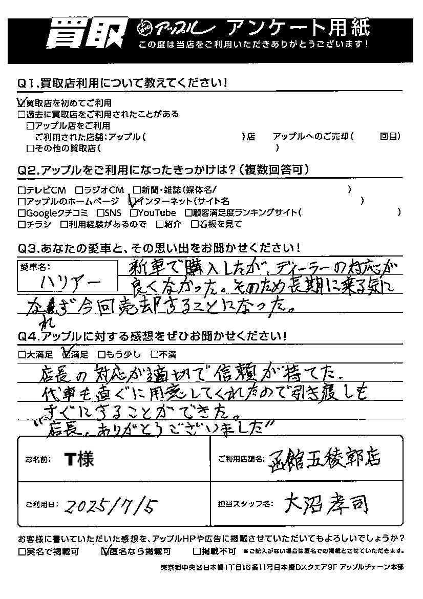 店長の対応が適切で信頼が持てた。代車も直ぐに用意してくれたので引き渡しもすぐにすることができた。“店長、ありがとうございました”