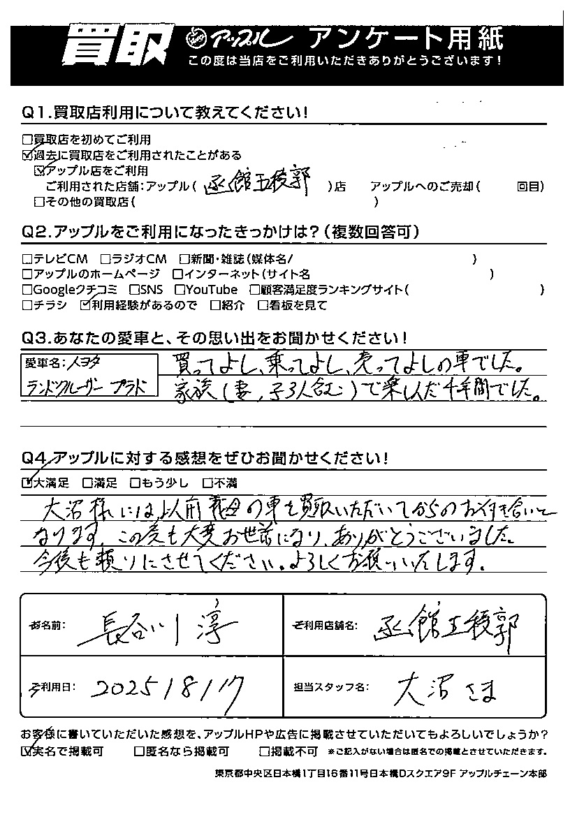 大沼様には以前 義母の車を買取いただいてからのお付き合いとなります。この度も大変お世話になり、ありがとうございました。今後も頼りにさせてください。よろしくお願いいたします。