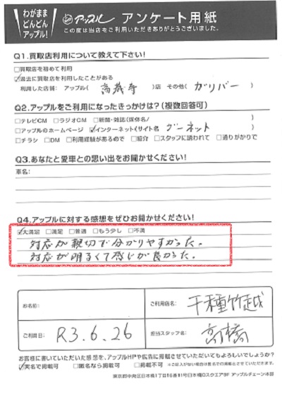お車のご相談・ 査定だけでもOK! カンタン 入力 30秒 アップルがブランド買取始めました! お電話でも受付中! 受付時間9:30~18:30 052-711-8400 お車のご相談・ 査定だけでもOK! カンタン 入力 30秒 アップルがブランド買取始めました! お電話でも受付中! 受付時間9:30~18:30 052-711-8400 アップルがブランド買取始めました! お電話でも受付中! 受付時間9:30~18:30 052-711-8400 店舗情報 在庫車 スタッフ紹介 ブログ お客様の声 キャンペーン 無料査定 click お客様の声 ご記入日: 2021/06/26 K様 車名:スズキ アルトラパン ラパン(アルト) 対応が親切で分かりやすかった。対応が明るくて感じが良かった。 前へ 次へ お客様の声一覧を見る