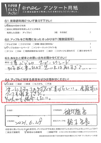 お車のご相談・ 査定だけでもOK! カンタン 入力 30秒 アップルがブランド買取始めました! お電話でも受付中! 受付時間9:30~18:30 052-711-8400 お車のご相談・ 査定だけでもOK! カンタン 入力 30秒 アップルがブランド買取始めました! お電話でも受付中! 受付時間9:30~18:30 052-711-8400 アップルがブランド買取始めました! お電話でも受付中! 受付時間9:30~18:30 052-711-8400 店舗情報 在庫車 スタッフ紹介 ブログ お客様の声 キャンペーン 無料査定 click お客様の声 ご記入日: 2021/06/28 I様 車名:三菱 パジェロ 第一にスタッフの対応がすばらしい。金額等についても満足できた。知人にも紹介したい。 前へ 次へ お客様の声一覧を見る