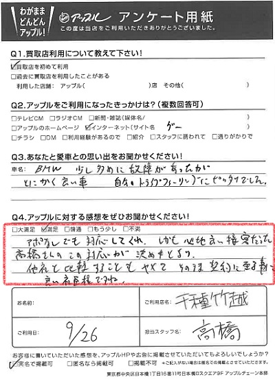 お車のご相談・ 査定だけでもOK! カンタン 入力 30秒 アップルがブランド買取始めました! お電話でも受付中! 受付時間9:30~18:30 052-711-8400 お車のご相談・ 査定だけでもOK! カンタン 入力 30秒 アップルがブランド買取始めました! お電話でも受付中! 受付時間9:30~18:30 052-711-8400 アップルがブランド買取始めました! お電話でも受付中! 受付時間9:30~18:30 052-711-8400 店舗情報 在庫車 スタッフ紹介 ブログ お客様の声 キャンペーン 無料査定 click お客様の声 ご記入日: 2021/09/26 S様 車名:BMW 満足度★★★★アポなしでも対応してくれ、しかも心地良い接客だった高橋さんのこの対応が決め手となり、他社と比較することもヤメて そのまま契約に至る事に。良い社員様ですね。 前へ 次へ お客様の声一覧を見る