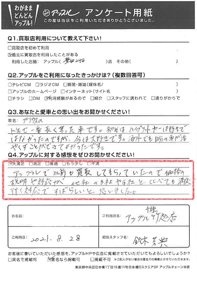 お車のご相談・ 査定だけでもOK! カンタン 入力 30秒 アップルがブランド買取始めました! お電話でも受付中! 受付時間9:30~18:30 052-711-8400 お車のご相談・ 査定だけでもOK! カンタン 入力 30秒 アップルがブランド買取始めました! お電話でも受付中! 受付時間9:30~18:30 052-711-8400 アップルがブランド買取始めました! お電話でも受付中! 受付時間9:30~18:30 052-711-8400 店舗情報 在庫車 スタッフ紹介 ブログ お客様の声 キャンペーン 無料査定 click お客様の声 ご記入日: 2021/08/28 H様 車名:トヨタ プリウスα 満足度★★★★★アップルで以前も買取してもらっていたので、価格の説明や対応が他社と比べても満足いく対応ですばらしいと思いました。 前へ 次へ お客様の声一覧を見る