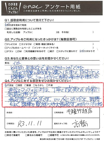お車のご相談・ 査定だけでもOK! カンタン 入力 30秒 アップルがブランド買取始めました! お電話でも受付中! 受付時間9:30~18:30 052-711-8400 お車のご相談・ 査定だけでもOK! カンタン 入力 30秒 アップルがブランド買取始めました! お電話でも受付中! 受付時間9:30~18:30 052-711-8400 アップルがブランド買取始めました! お電話でも受付中! 受付時間9:30~18:30 052-711-8400 店舗情報 在庫車 スタッフ紹介 ブログ お客様の声 キャンペーン 無料査定 click お客様の声 ご記入日: 2021/11/11 M様 車名:トヨタ ist 満足度★★★★★担当スタッフの応対は、丁寧で誠実さが非常に好感が持てた。満足度200%です。いい人に巡り合え、気持ち良く、愛車を売却でき大満足です。ありがとうございました。 前へ 次へ お客様の声一覧を見る