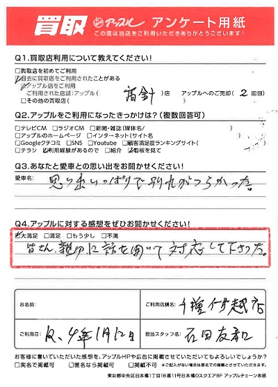 お車のご相談・ 査定だけでもOK! カンタン 入力 30秒 アップルがブランド買取始めました! お電話でも受付中! 受付時間9:30~18:30 052-711-8400 お車のご相談・ 査定だけでもOK! カンタン 入力 30秒 アップルがブランド買取始めました! お電話でも受付中! 受付時間9:30~18:30 052-711-8400 アップルがブランド買取始めました! お電話でも受付中! 受付時間9:30~18:30 052-711-8400 店舗情報 在庫車 スタッフ紹介 ブログ お客様の声 キャンペーン 無料査定 click お客様の声 ご記入日: 2022/01/12 N様 車名:トヨタ カローラアクシオ 満足度★★★★★皆さん、親切に話を聞いて対応して下さった。 前へ 次へ お客様の声一覧を見る