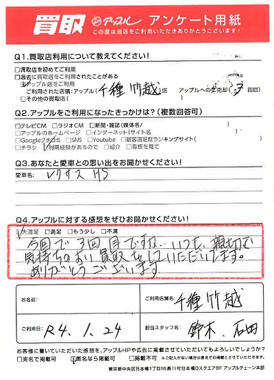 お車のご相談・ 査定だけでもOK! カンタン 入力 30秒 アップルがブランド買取始めました! お電話でも受付中! 受付時間9:30~18:30 052-711-8400 お車のご相談・ 査定だけでもOK! カンタン 入力 30秒 アップルがブランド買取始めました! お電話でも受付中! 受付時間9:30~18:30 052-711-8400 アップルがブランド買取始めました! お電話でも受付中! 受付時間9:30~18:30 052-711-8400 店舗情報 在庫車 スタッフ紹介 ブログ お客様の声 キャンペーン 無料査定 click お客様の声 ご記入日: 2022/01/24 N様 車名:レクサス HS (国内仕様 右H) 満足度★★★★★今回で3回目ですが、いつも親切で気持ちのよい買取をしていただいてます。ありがとうございます。 前へ 次へ お客様の声一覧を見る