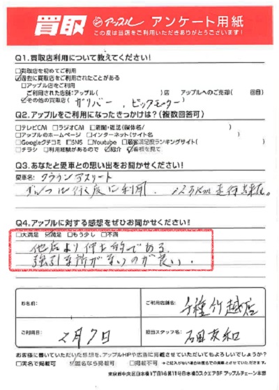 お車のご相談・ 査定だけでもOK! カンタン 入力 30秒 アップルがブランド買取始めました! お電話でも受付中! 受付時間9:30~18:30 052-711-8400 お車のご相談・ 査定だけでもOK! カンタン 入力 30秒 アップルがブランド買取始めました! お電話でも受付中! 受付時間9:30~18:30 052-711-8400 アップルがブランド買取始めました! お電話でも受付中! 受付時間9:30~18:30 052-711-8400 店舗情報 在庫車 スタッフ紹介 ブログ お客様の声 キャンペーン 無料査定 click お客様の声 ご記入日: 2022/02/07 N様 車名:トヨタ クラウンアスリート (H11年9月~H30年6月) 満足度★★★★他店より紳士的である。強引な所がないのが良い。 前へ 次へ お客様の声一覧を見る