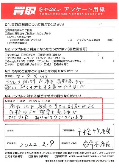お車のご相談・ 査定だけでもOK! カンタン 入力 30秒 アップルがブランド買取始めました! お電話でも受付中! 受付時間9:30~18:30 052-711-8400 お車のご相談・ 査定だけでもOK! カンタン 入力 30秒 アップルがブランド買取始めました! お電話でも受付中! 受付時間9:30~18:30 052-711-8400 アップルがブランド買取始めました! お電話でも受付中! 受付時間9:30~18:30 052-711-8400 店舗情報 在庫車 スタッフ紹介 ブログ お客様の声 キャンペーン 無料査定 click お客様の声 ご記入日: 2022/03/09 N様 車名:トヨタ マークX 満足度★★★★★店長以下、店員の方々の対応が良く 気持ちよく愛車を売る事ができました。ありがとうございます。 前へ 次へ お客様の声一覧を見る