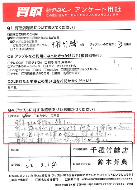 お車のご相談・ 査定だけでもOK! カンタン 入力 30秒 アップルがブランド買取始めました! お電話でも受付中! 受付時間9:30~18:30 052-711-8400 お車のご相談・ 査定だけでもOK! カンタン 入力 30秒 アップルがブランド買取始めました! お電話でも受付中! 受付時間9:30~18:30 052-711-8400 アップルがブランド買取始めました! お電話でも受付中! 受付時間9:30~18:30 052-711-8400 店舗情報 在庫車 スタッフ紹介 ブログ お客様の声 キャンペーン 無料査定 click お客様の声 ご記入日: 2022/03/14 T様 車名:スバル R1 満足度★★★★鈴木さんの笑顔が嬉しい。思った額とまではいかなくても、他店より評価が高い。後日送られてくる車の報告の写真も嬉しい。自然な、押し付けでない感じが良い。 前へ 次へ お客様の声一覧を見る