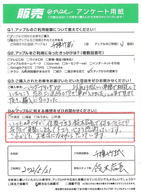 お車のご相談・ 査定だけでもOK! カンタン 入力 30秒 アップルがブランド買取始めました! お電話でも受付中! 受付時間9:30~18:30 052-711-8400 お車のご相談・ 査定だけでもOK! カンタン 入力 30秒 アップルがブランド買取始めました! お電話でも受付中! 受付時間9:30~18:30 052-711-8400 アップルがブランド買取始めました! お電話でも受付中! 受付時間9:30~18:30 052-711-8400 店舗情報 在庫車 スタッフ紹介 ブログ お客様の声 キャンペーン 無料査定 click お客様の声 ご記入日: 2022/05/21 S様 車名:マツダ アテンザ 満足度★★★★★いつもの事ですが、信頼できる鈴木店長で何を伝えても笑顔で真摯に対して下さり、心より感謝しています。これからもお世話になれたらと思っています。 前へ 次へ お客様の声一覧を見る