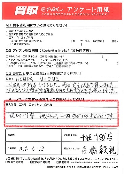 お車のご相談・ 査定だけでもOK! カンタン 入力 30秒 アップルがブランド買取始めました! お電話でも受付中! 受付時間9:30~18:30 052-711-8400 お車のご相談・ 査定だけでもOK! カンタン 入力 30秒 アップルがブランド買取始めました! お電話でも受付中! 受付時間9:30~18:30 052-711-8400 アップルがブランド買取始めました! お電話でも受付中! 受付時間9:30~18:30 052-711-8400 店舗情報 在庫車 スタッフ紹介 ブログ お客様の声 キャンペーン 無料査定 click お客様の声 ご記入日: 2022/06/13 N様 車名:ホンダ N-ONE 満足度★★★★★親切・丁寧 他社より一番分かりやすかったです。 前へ 次へ お客様の声一覧を見る
