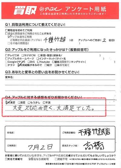 お車のご相談・ 査定だけでもOK! カンタン 入力 30秒 アップルがブランド買取始めました! お電話でも受付中! 受付時間9:30~18:30 052-711-8400 お車のご相談・ 査定だけでもOK! カンタン 入力 30秒 アップルがブランド買取始めました! お電話でも受付中! 受付時間9:30~18:30 052-711-8400 アップルがブランド買取始めました! お電話でも受付中! 受付時間9:30~18:30 052-711-8400 店舗情報 在庫車 スタッフ紹介 ブログ お客様の声 キャンペーン 無料査定 click お客様の声 ご記入日: 2022/07/02 G・T様 車名:トヨタ ヴィッツ 満足度★★★★★大変対応が良く、大満足でした。 前へ 次へ お客様の声一覧を見る
