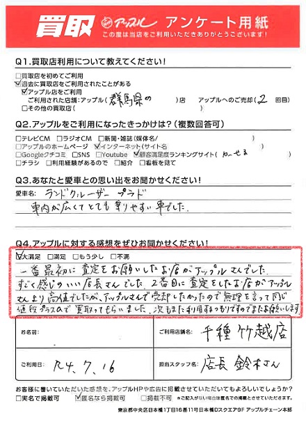 1番最初に査定をお願いしたお店がアップルさんでした。すごく感じのいい店長さんでした。
