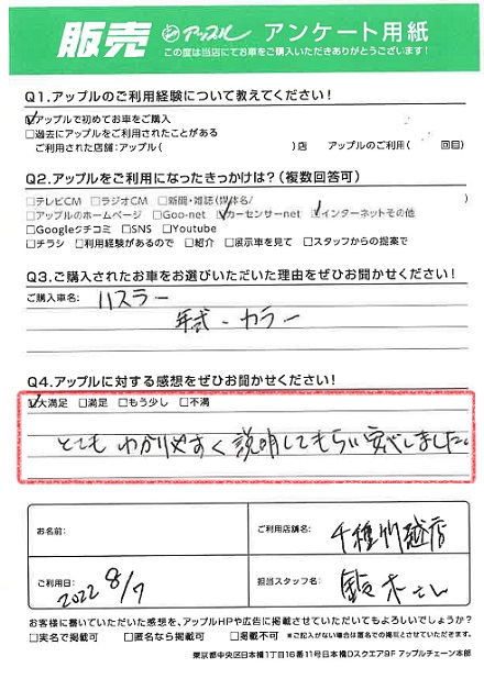 お車のご相談・ 査定だけでもOK! カンタン 入力 30秒 アップルがブランド買取始めました! お電話でも受付中! 受付時間9:30~18:30 052-711-8400 お車のご相談・ 査定だけでもOK! カンタン 入力 30秒 アップルがブランド買取始めました! お電話でも受付中! 受付時間9:30~18:30 052-711-8400 アップルがブランド買取始めました! お電話でも受付中! 受付時間9:30~18:30 052-711-8400 店舗情報 在庫車 スタッフ紹介 ブログ お客様の声 キャンペーン 無料査定 click お客様の声 ご記入日: 2022/08/07 S様 車名:スズキ ハスラー 満足度★★★★★とてもわかりやすく説明してもらい、安心しました。 前へ 次へ お客様の声一覧を見る