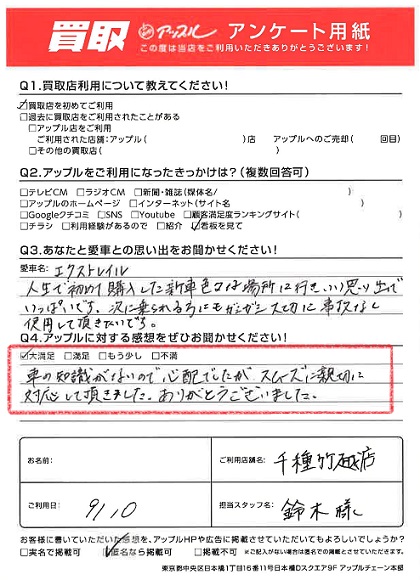 お車のご相談・ 査定だけでもOK! カンタン 入力 30秒 アップルがブランド買取始めました! お電話でも受付中! 受付時間9:30~18:30 052-711-8400 お車のご相談・ 査定だけでもOK! カンタン 入力 30秒 アップルがブランド買取始めました! お電話でも受付中! 受付時間9:30~18:30 052-711-8400 アップルがブランド買取始めました! お電話でも受付中! 受付時間9:30~18:30 052-711-8400 店舗情報 在庫車 スタッフ紹介 ブログ お客様の声 キャンペーン 無料査定 click お客様の声 ご記入日: 2022/09/10 A様 車名:日産 エクストレイル 満足度★★★★★車の知識がないので心配でしたが、スムーズに親切に対応していただきました。ありがとうございました。 前へ 次へ お客様の声一覧を見る