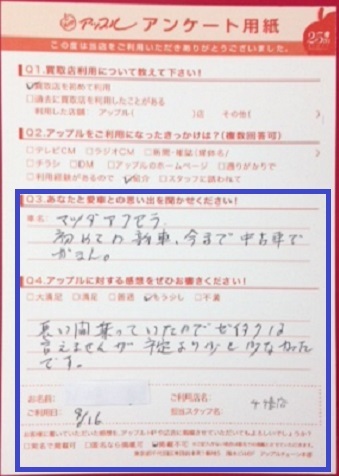 お車のご相談・ 査定だけでもOK! カンタン 入力 30秒 アップルがブランド買取始めました! お電話でも受付中! 受付時間9:30~18:30 052-711-8400 お車のご相談・ 査定だけでもOK! カンタン 入力 30秒 アップルがブランド買取始めました! お電話でも受付中! 受付時間9:30~18:30 052-711-8400 アップルがブランド買取始めました! お電話でも受付中! 受付時間9:30~18:30 052-711-8400 店舗情報 在庫車 スタッフ紹介 ブログ お客様の声 キャンペーン 無料査定 click お客様の声 ご記入日: 2014/09/16 T・T様 ■ご利用日時■ H26年9月16日■車種■アクセラ■担当者■ 鈴木【アップルに対する感想をぜひお書きください】満足度★★★長い間乗っていたので贅沢は言えませんが予定より少し少なかったです。 前へ 次へ お客様の声一覧を見る