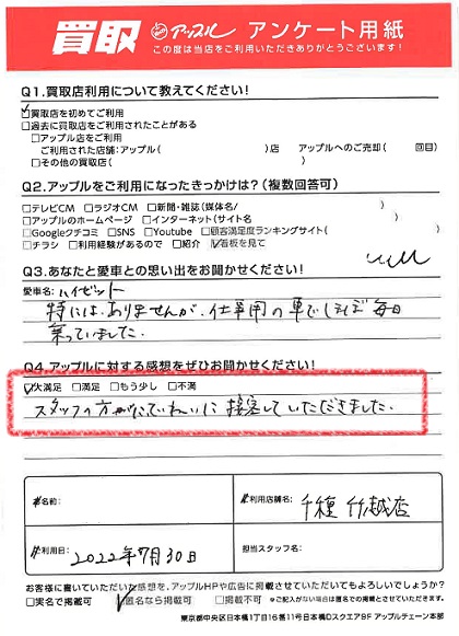 お車のご相談・ 査定だけでもOK! カンタン 入力 30秒 アップルがブランド買取始めました! お電話でも受付中! 受付時間9:30~18:30 052-711-8400 お車のご相談・ 査定だけでもOK! カンタン 入力 30秒 アップルがブランド買取始めました! お電話でも受付中! 受付時間9:30~18:30 052-711-8400 アップルがブランド買取始めました! お電話でも受付中! 受付時間9:30~18:30 052-711-8400 店舗情報 在庫車 スタッフ紹介 ブログ お客様の声 キャンペーン 無料査定 click お客様の声 ご記入日: 2022/07/30 M様 車名:ダイハツ ハイゼットカーゴ 満足度★★★★★スタッフの方に、ていねいに接客していただきました。 前へ 次へ お客様の声一覧を見る