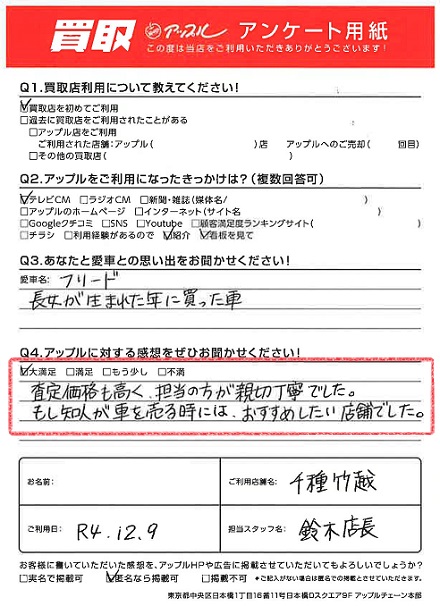 お車のご相談・ 査定だけでもOK! カンタン 入力 30秒 アップルがブランド買取始めました! お電話でも受付中! 受付時間9:30~18:30 052-711-8400 お車のご相談・ 査定だけでもOK! カンタン 入力 30秒 アップルがブランド買取始めました! お電話でも受付中! 受付時間9:30~18:30 052-711-8400 アップルがブランド買取始めました! お電話でも受付中! 受付時間9:30~18:30 052-711-8400 店舗情報 在庫車 スタッフ紹介 ブログ お客様の声 キャンペーン 無料査定 click お客様の声 ご記入日: 2022/12/09 I様 車名:ホンダ フリード(H28年9月以降のハイブリッド含む) 満足度★★★★★査定価格も高く、担当の方が親切丁寧でした。もし知人が車を売る時には、おすすめしたい店舗でした。 前へ 次へ お客様の声一覧を見る